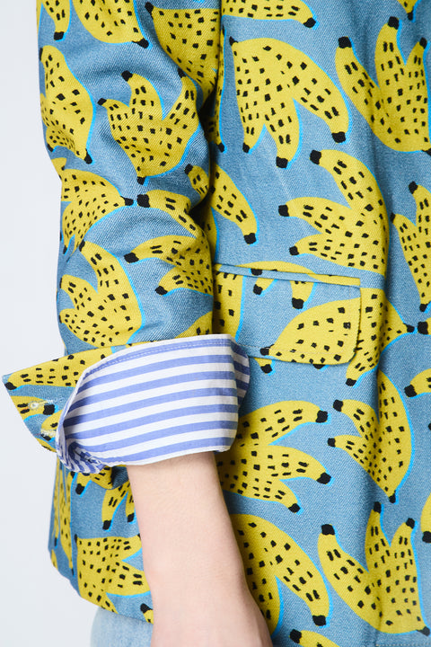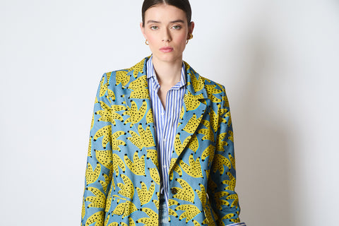 A print that screams fun, the Banana Split blazer is crafted from 100% cotton denim and is relaxed as it is fun. Of course with our KIPPER details; bright blue buttons and striped mustard lining. We like to wear ours with a striped trouser or a neutral pant. Let the jacket do the talking. You will have a lot of fun in this jacket! The Skipper suggests sizing up to make even more of a statement.
