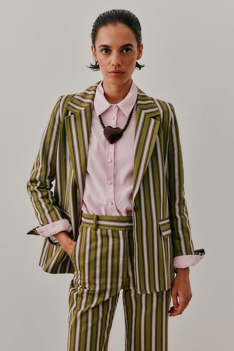 the distinctive Colonnade green stripe on organic cotton. She's mad without being too mad! The single-breasted silhouette combines clean lines with effortless versatility, offering a contemporary yet timeless look for every season.