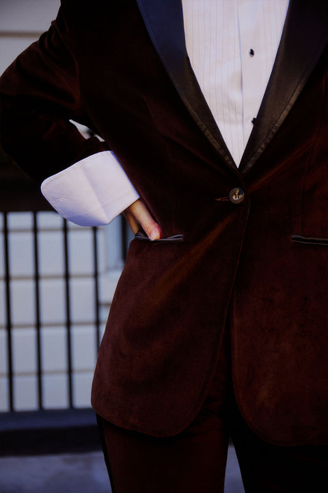 Meet the Tuxedo Suit that you want to party in! A KIPPER take on a real classic. A rich chocolate velvet suit with added black satin detailing, which will be sure to make you stand out. We promise that a side stripe down your trousers elongates your legs.